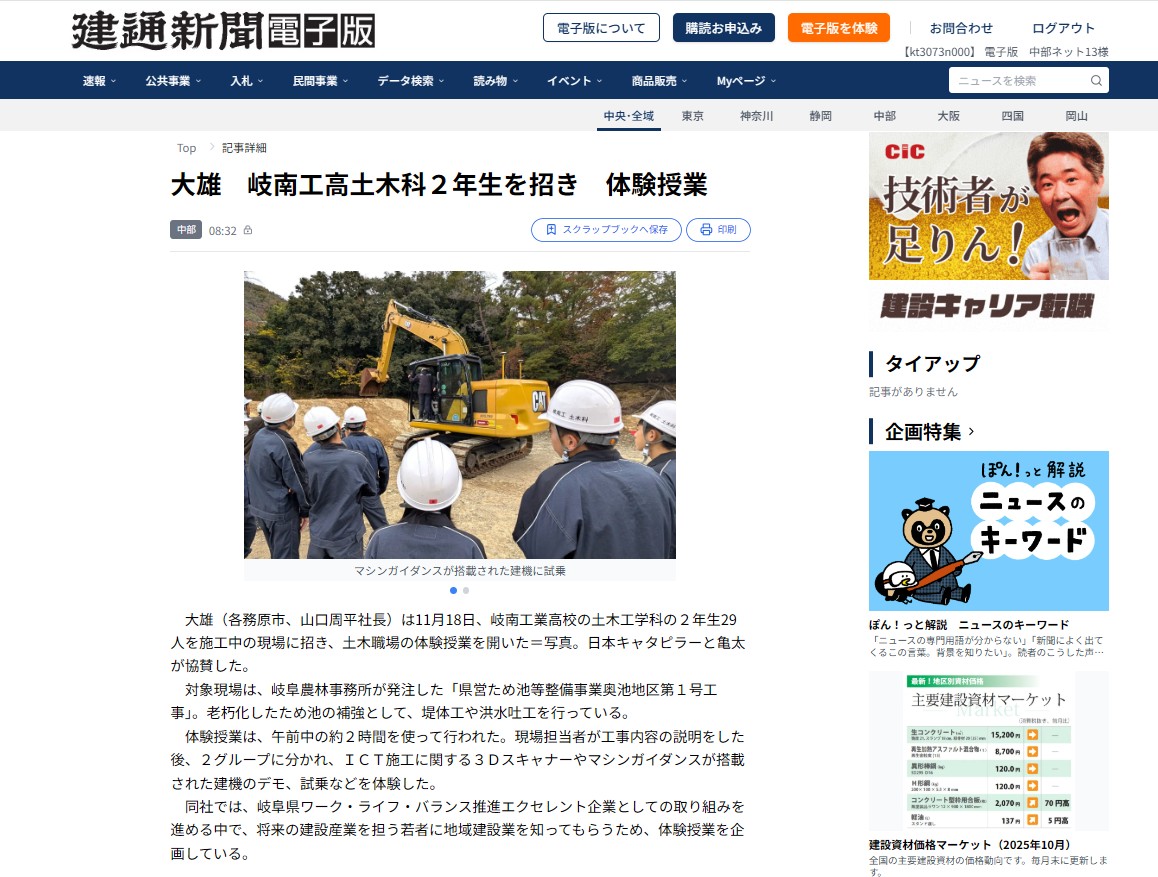 土木工事の体験授業の様子がが建通新聞に取り上げられました!